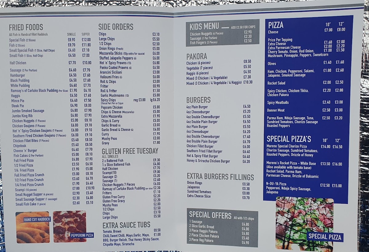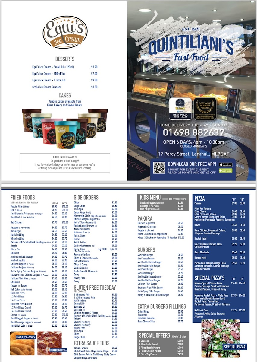 The menu at Quintiliani's Fish & Chips offers a wide range of dishes that cater to all tastes. Their Special Fish and Fish options are standout choices, with the Special Fish possibly being the highlight of the fried food section. For those looking for something more substantial, the Half Chicken is a satisfying option. Side dishes like Chips and Onion Rings complement the main meals, with the option of Large Chips or even a 1/2 Chips portion. For a special treat, Mozzarella Sticks offer a delightful alternative. On Gluten Free Tuesday, customers can enjoy 2 X Battered Fish, Half Chicken, or even Scampi and Sausage, ensuring there’s something for everyone. The Kids Menu keeps things simple and tasty with favorites like Chicken Nuggets, Sausage, and Fish Fingers. For burger lovers, Quintiliani’s serves up a variety of burgers, from a simple 4oz Plain Burger to the heartier 6oz Plain Burger, with options to customize with toppings like Onion Rings or Jalapenos. The Special Offers section includes great deals like a 1 Sausage with 2 Slice Garlic Bread and 3 Piece Haggis Pakora. Pizzas also make an appearance, with unique options such as Moreno's Rocket Pizza (White Base) and N-Du-Ya Pizza, along with smaller indulgences like Equi's Ice Cream in various sizes. For a more adventurous pizza, try the Moreno Special Chorizo Pizza. Finally, to finish off the meal, you can’t go wrong with a Crolla Ice Cream Sundae for dessert.